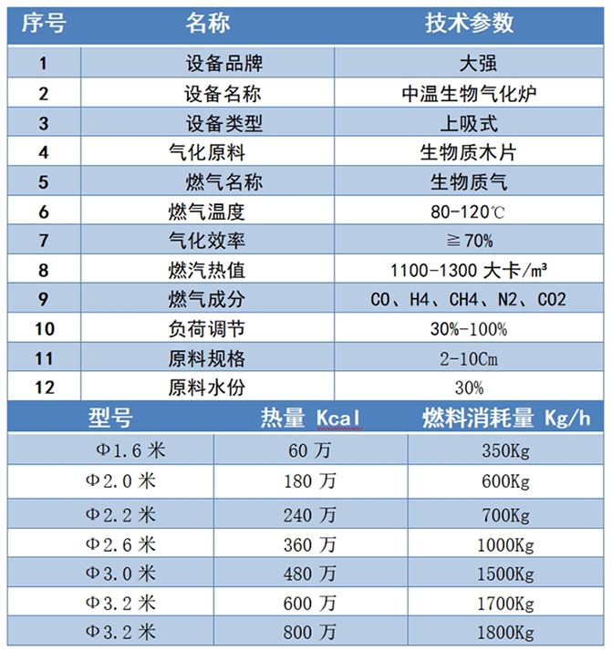 生物氣化爐主要技術參數(shù)及規(guī)格