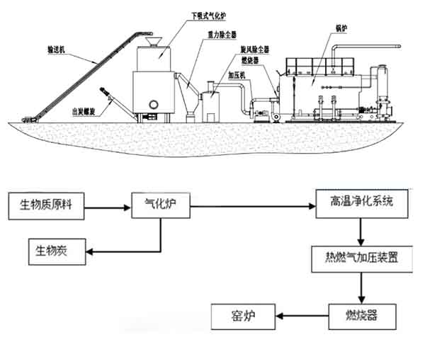 生物質(zhì)原料通過螺旋加料機加入氣化爐,而氣化所需要的空氣通過鼓風(fēng)機從氣化爐底部的配風(fēng)裝置進入氣化爐內(nèi),生物質(zhì)原料在缺氧狀態(tài)下燃燒生成可燃氣體和焦油,部分焦油在高溫下發(fā)生二次裂解為不凝性可燃氣體。熱分解析出的焦碳與燃燒產(chǎn)生的水蒸汽和二氧化碳進行還原反應(yīng),產(chǎn)生氫氣、一氧化碳等可燃氣體,在氣體上升過程中,繼續(xù)進行還原和熱解反應(yīng)。氣態(tài)焦油、氣體連同灰渣顆粒、焦碳從氣化爐上部流出,進入隨后的燃氣凈化分離裝置旋風(fēng)除塵器,進入旋風(fēng)除塵器絕大部分灰渣通過旋風(fēng)除塵器從燃氣中分離出來?;以ㄟ^除灰裝置、灰輸送裝置輸送到合適的地點。旋風(fēng)除塵器分離出來的燃氣進入燃氣加壓裝置,被壓送到鍋爐燃燒機完全燃燒。